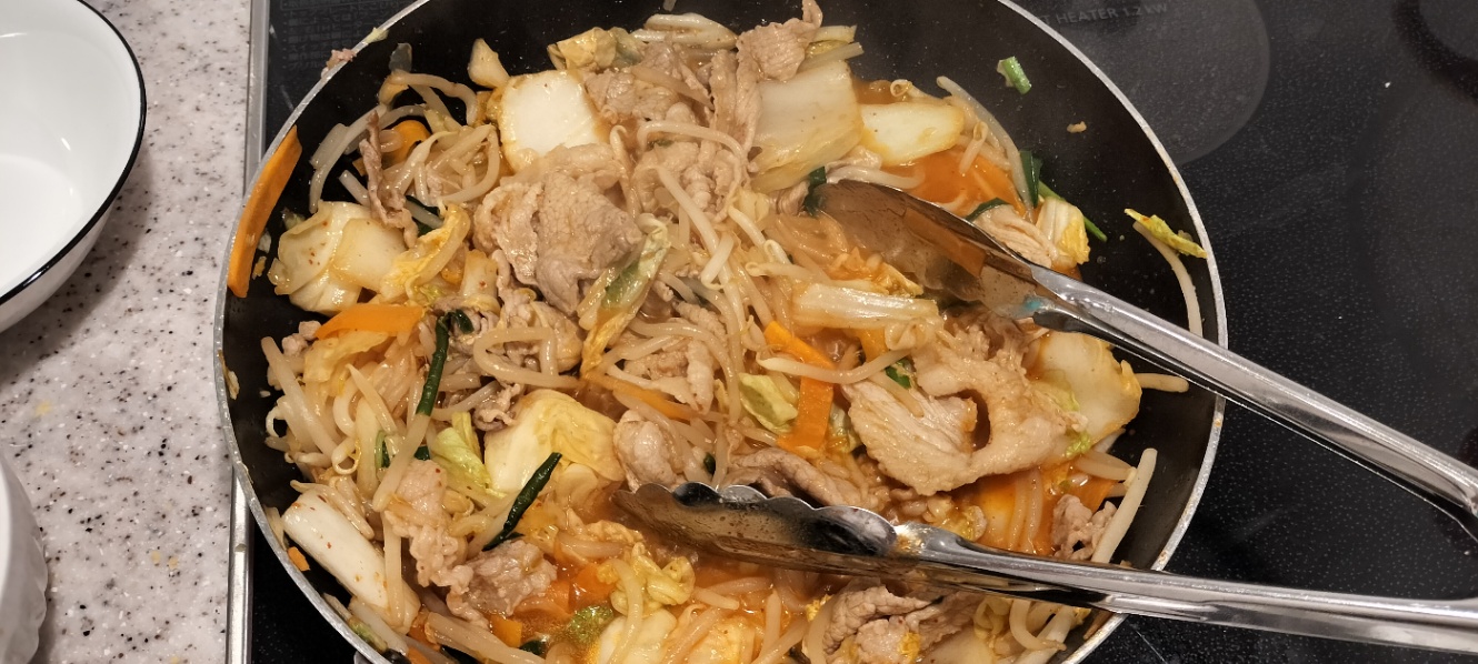 映画見ながら残りの豚肉とカット野菜で豚キムチ作った。