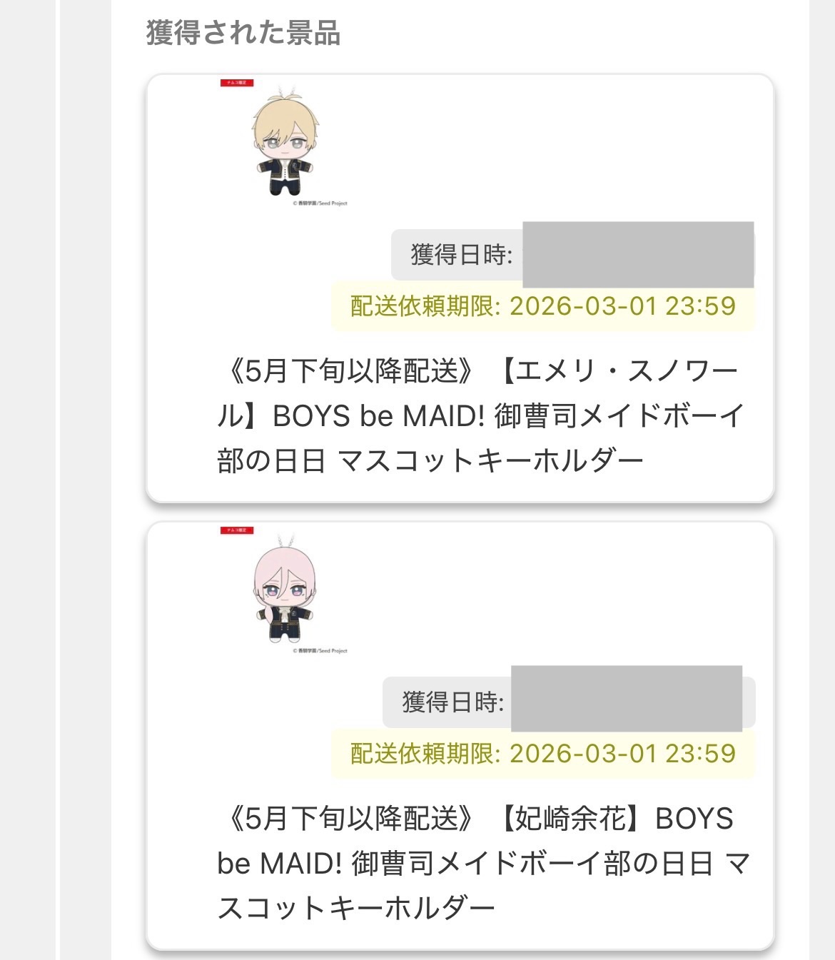 ▲ナムクレでビーメイの制服ぬいの先行販売が始まったので早速ゲット。ビーメイは「ひとり選ばなきゃ殺す」って刃物向けられたら泣きながら余花さんを選ぶと思うんだけど、そうでなければ本当に全員好きで箱推しって感じなのでいつも誰を手に入れるか迷っちゃう。ドツボにハマって複数人を天井する可能性もあるからひとまず11000ポイントを購入して挑んだんだけど、意外と8200ポイントくらい余っちゃったので他の子も獲ろうかなあ…… いやそれよりまず部屋を片付けないと。ぬいが来る5月下旬までになんとかするぞ~っ
