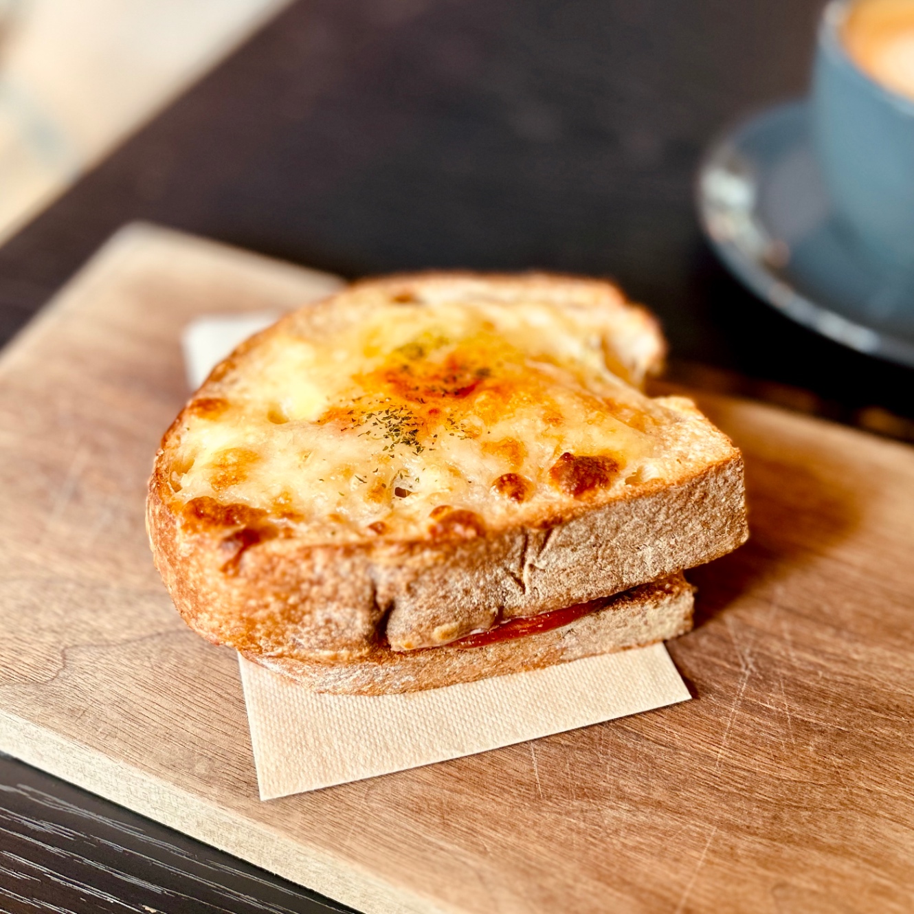 ▲クロックムッシュ。ほんのり酸味のあるライ麦入りブレッドがザクザク。キャンプに来たみたいな木製プレートの上で、これまたキャンプに来たみたいなギザギザのナイフでギコギコしながら食べるのが楽しい。