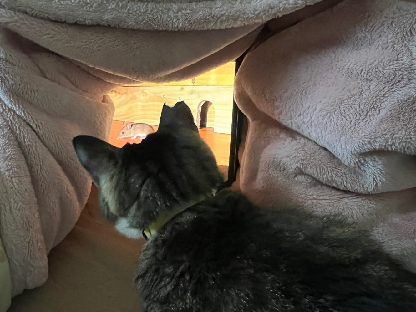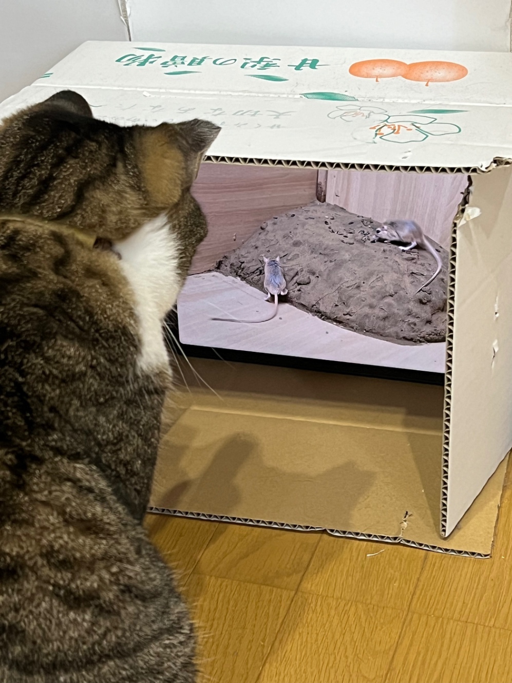 トムとジェリーの如く、窓の向こう側に、潜んで暮らしてるようにちょろちょろしているネズミが見える、猫版VRとかARとかそういう感じになる。