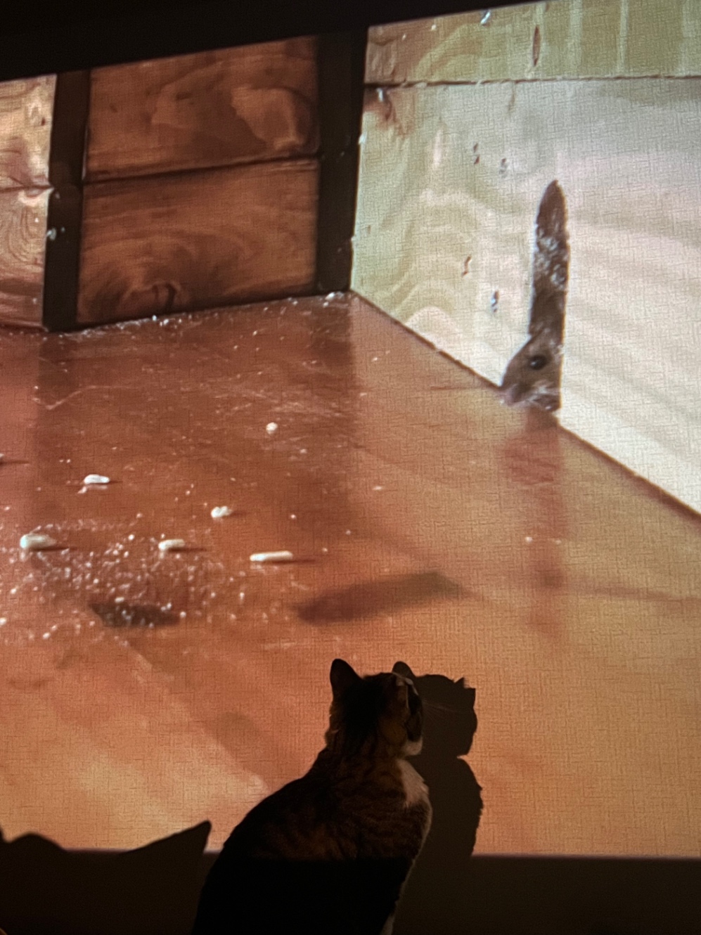 先に出したように、ユーチューブで検索すると猫が喜ぶ小鳥の餌場の動画とか、ネズミの走る動画とか、そういうのがごまんと出てくるのでそれを投影すると、ねこが食い入るように見るのだ。