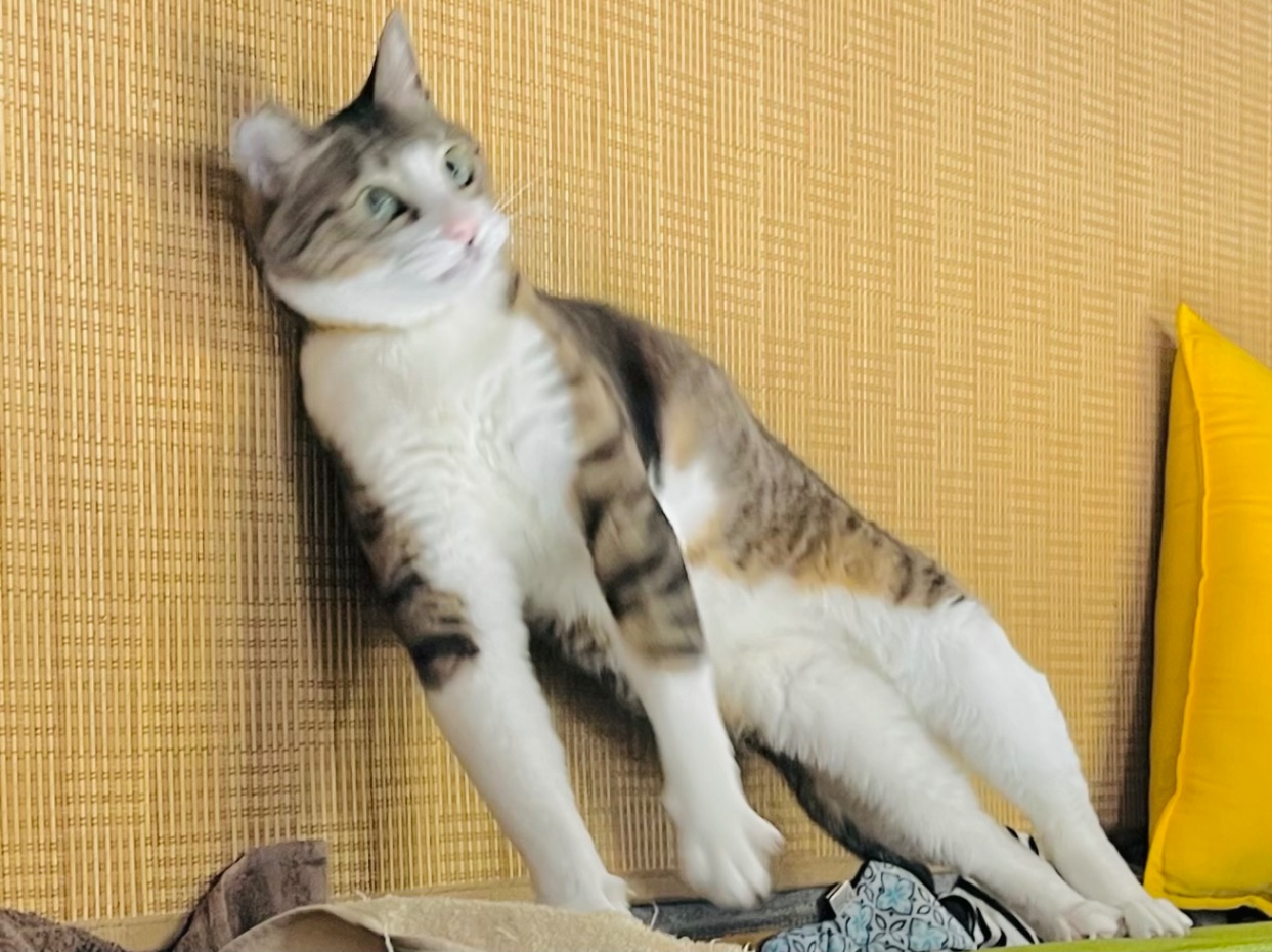 齢9歳、年齢を感じぬ元気さだが下っ腹のルーズスキンはタルッタル。ごらんの通り時に一斤のパンのようにもなるため、ほっそりというわけではないが、標準範囲の体型で体重5キロ。
