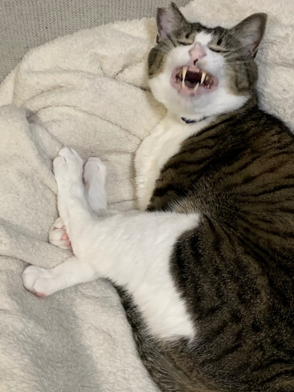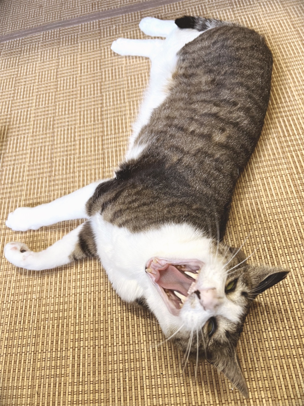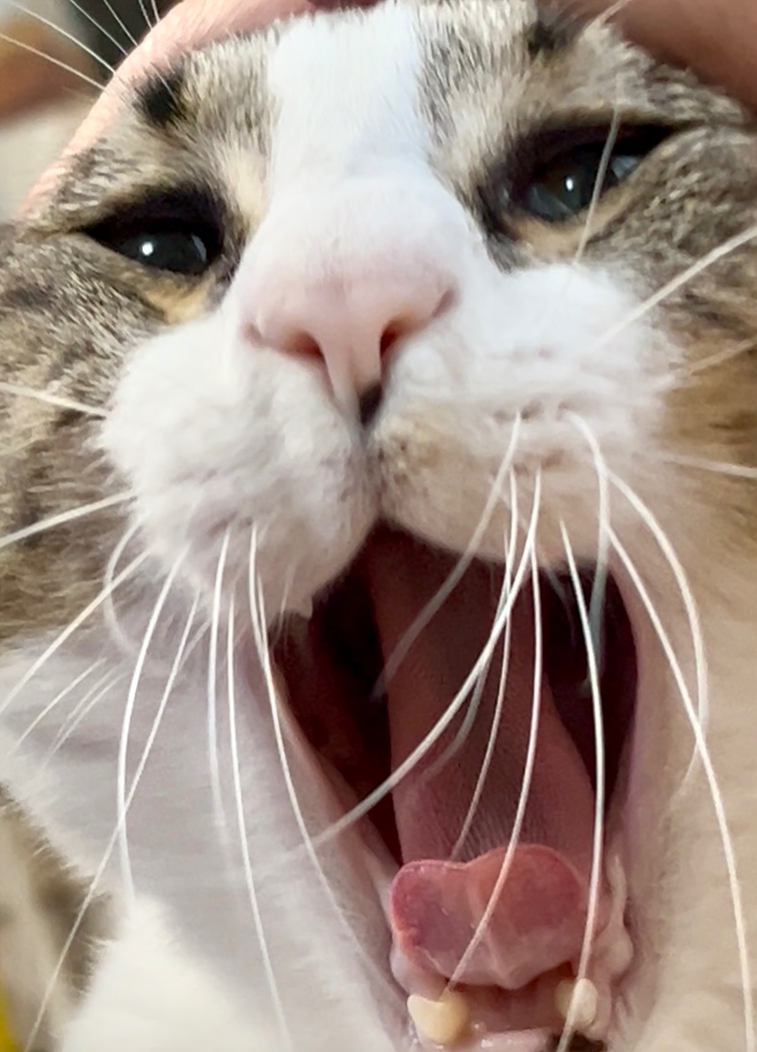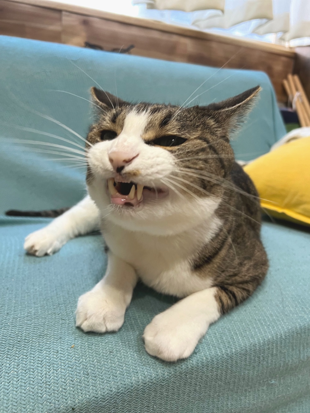 ねこは実は大層なおしゃべりやさんで、食う寝る喋るの3セットが欠かせないのだ。目が合えば「にゃん」呼べば「にゃにゃにゃん」。おしゃべりが止まらないのでこのように口が開いた写真が結構ある。