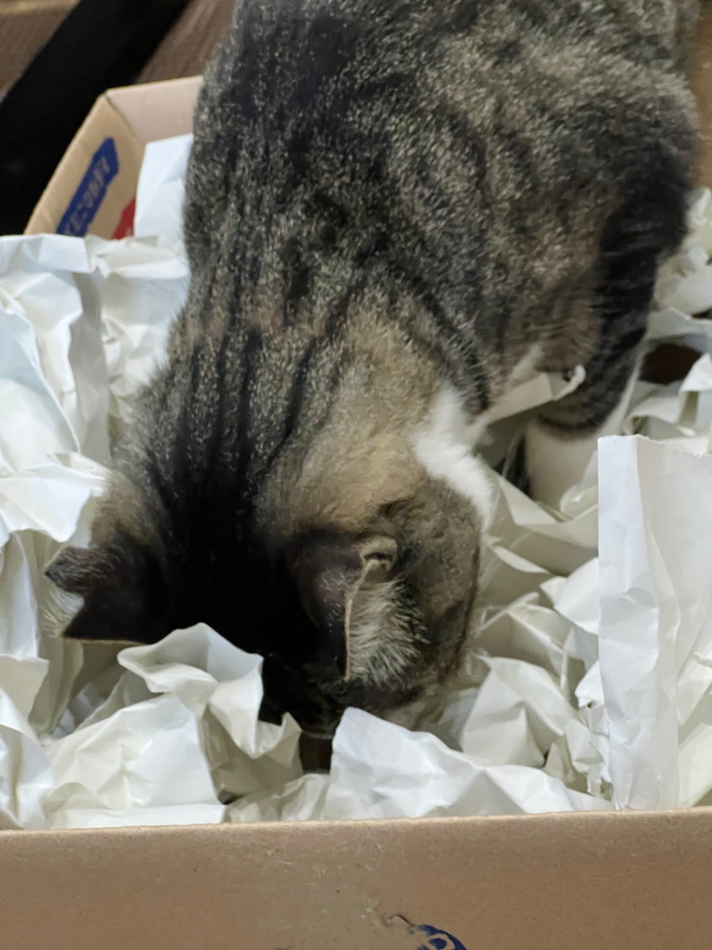 猫なら段ボールが好きだというのは世界の共通認識で、うちもご多分に漏れず好きだ。ただし入ることは好きではない。箱に入ることをいたく警戒する。