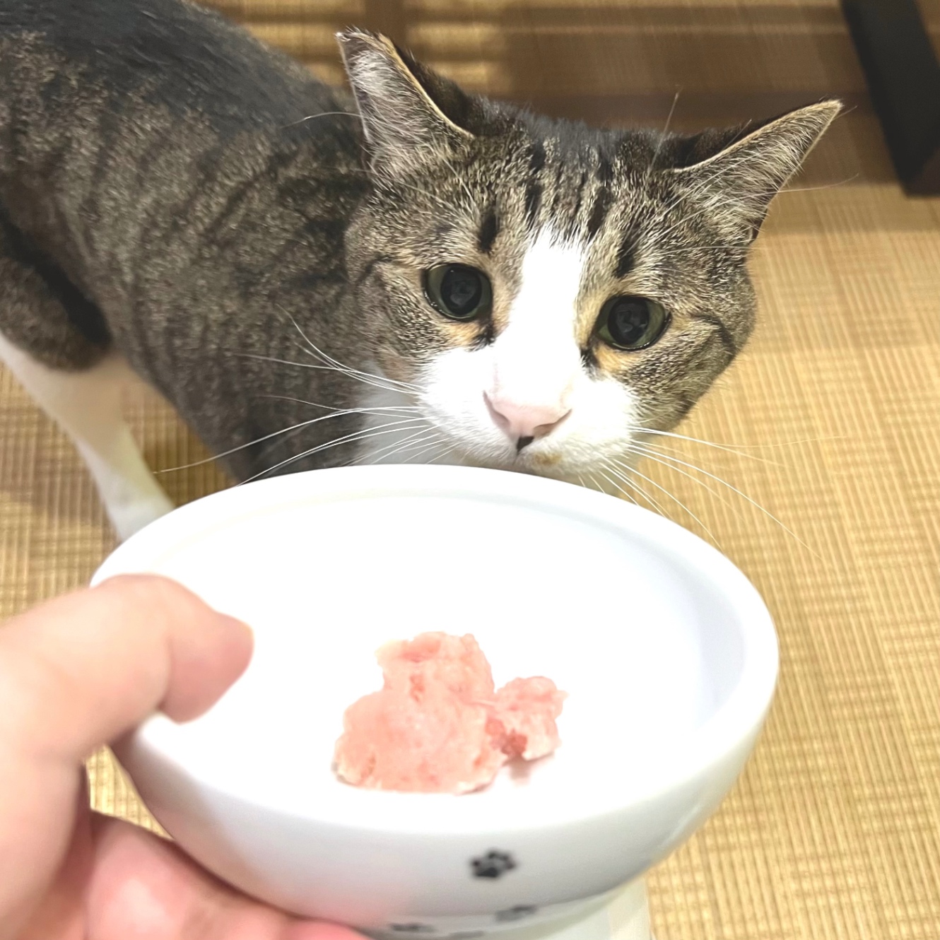 そんなこんなで私の業務が終わったら大急ぎで食事の用意をする傍ら、ねこもご飯を食べる。昼に開けたウェットの残り(一食でひとつは食べきれない)かカリカリ。たまに夕飯用に味付けなしの、マグロの刺身や鶏のささみの茹でたのがあればそれをお裾分けしたり。ねこは最近ようやくマグロ刺身がとても美味いと知った。