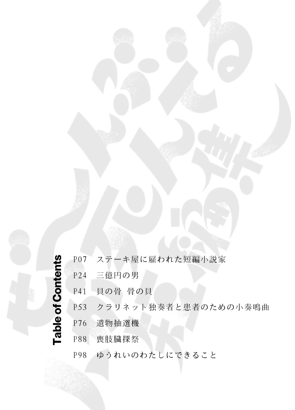 ということで、表紙と目次。今回はタイトルのタイポグラフィデザインのみデザイナーさん(Tシャツの作字デザインしてくれる人と同じ人)に依頼し(去年の冬出すつもりの本だったので以来は昨年に済んでいる。)表紙は自分で作ることに。シンプルな感じにしたかったので……。できればこれもシリーズにしたいなあと思う。何かと人が死ぬ話を書きすぎてるので、溜めてる話はめちゃくちゃある。