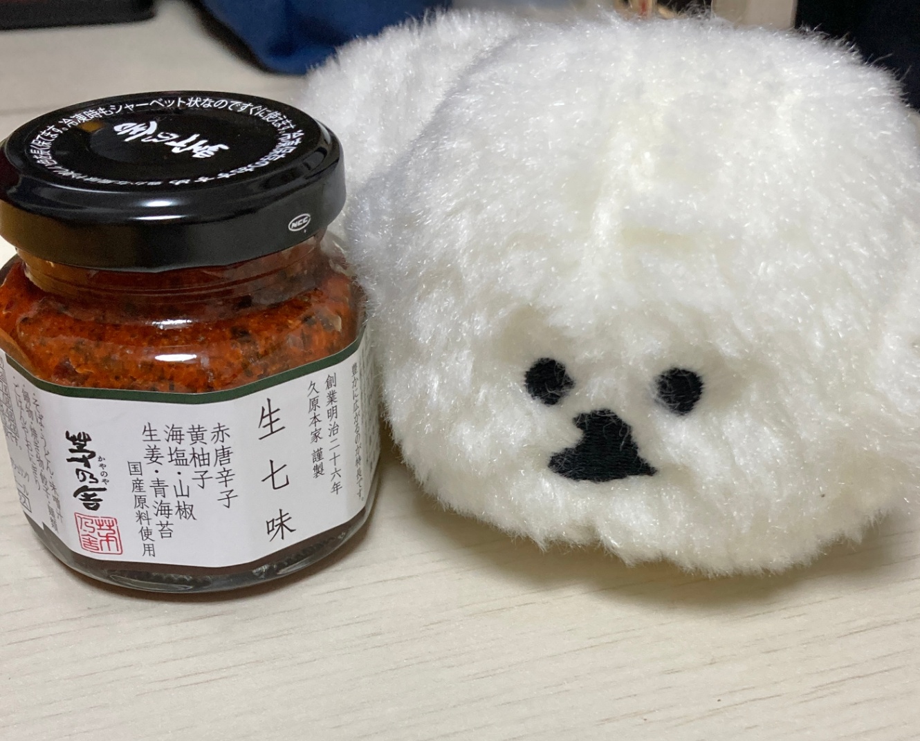 茅乃舎へ贈り物を選びに行ったついでにそういえば友達がおいしいって言ってたなこれと思い出して自分用に購入。早速翌日の晩御飯、寄せ鍋の薬味として使ったけどたしかにおいしい!普通のボトルに入ってる乾燥七味より材料が多いのか風味豊かで香り高い。特に柚子の存在を強く感じた。味変にすごくいい薬味だ!小瓶だけど、一回の使用量がほんの少しだから賞味期限までに使い切れるのかというところだけが不安だ…。なんか冷凍保存おすすめってパッケージに書かれてるんだけど信用しきれず冷蔵保存してる。冷凍…してもいいのか…?(蓋あかなくなりそう)