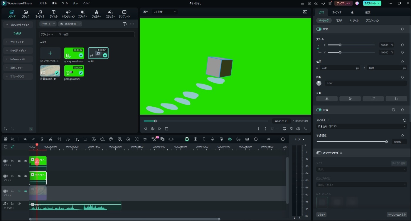 四角が転がるアニメと、転がった後に跡がついて行くようなアニメを作って別々で保存して、背景を用意してFilmoraでクロマキー合成する。