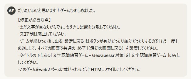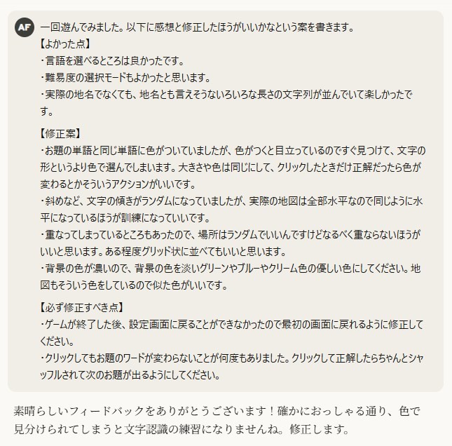 だいたい思った通りのものができたので良かった。ただ、文字が回転していたりしたので、それを整えてもらったり、終了ボタンの挙動がおかしかったのでそれを修正してもらった。