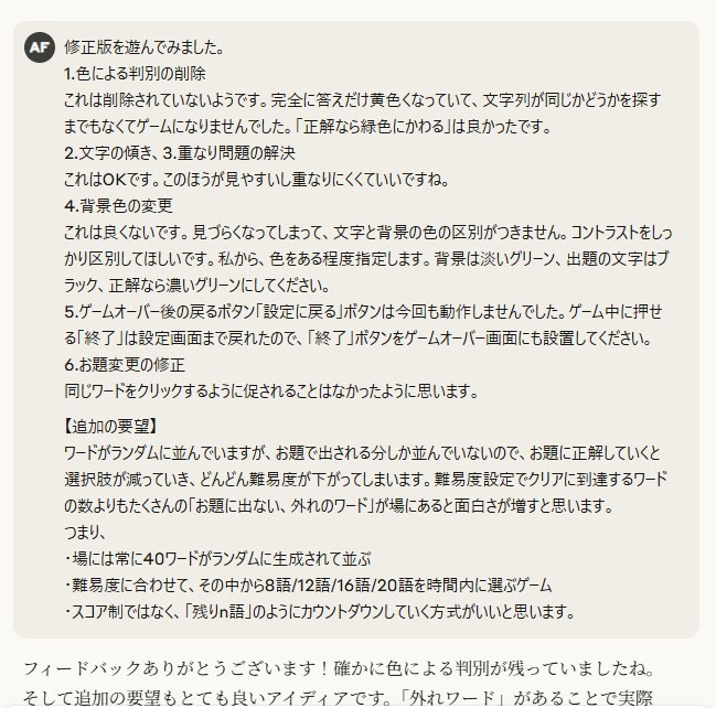 では、AIにゲームを作ってもらおう。思い浮かんだのはワードクラウドみたいに文字が散らばっていて(文字の大きさはちがわないほうがいい)、その中から任意の文字列を探し出すゲーム。文字列はめちゃくちゃでも構わない。まずは文字に慣れたいのだから。