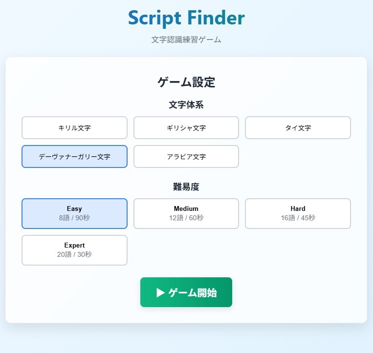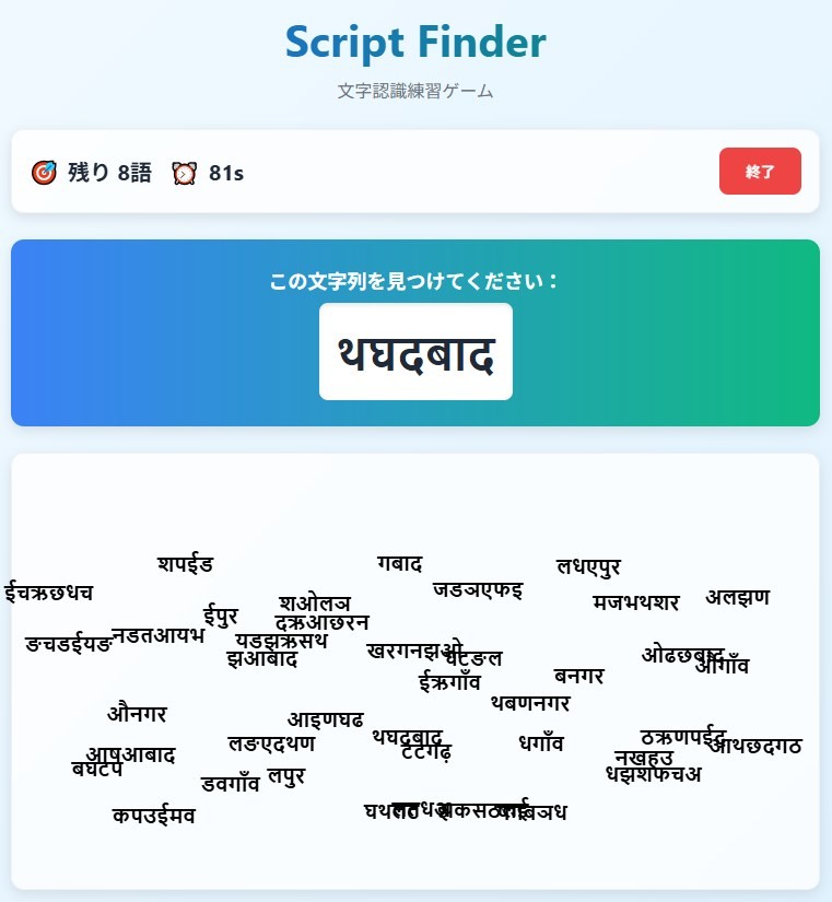 実際の地名を使うのは難しいので、各言語の文字体系の特徴を活かした架空の地名風の文字列を生成して、文字認識に慣れるためのゲームを作ります。