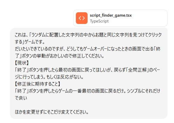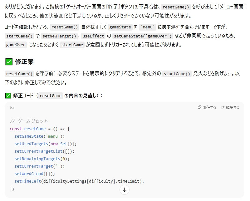 どうしても、「ゲームが終わった後に出る「設定に戻る」ボタンの不具合が治らないので、これをChatGPTのほうに持って行って見る。