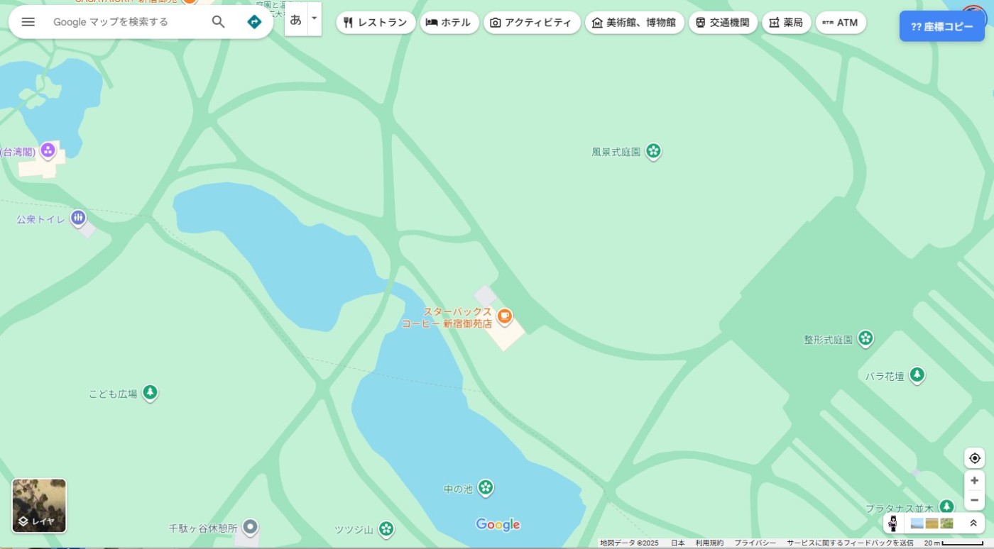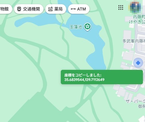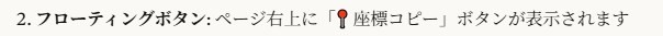 結果、できたのはこれ。右上に「??座標コピー」という青いボタンがあり、それを押すと座標がコピーされる。