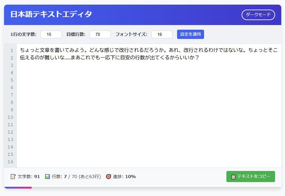 先日は、「15文字×70行の文章を依頼されたので、それを簡単に計算できるブラウザ上で使えるエディタを作って」と数回やり取りして、つくってもらったりした。 結局文章自体は別のエディタで書いた(ブラウザで書いてると保存しないで消えちゃうのが怖かった)が、何文字書いて何行使ってるかがわかりやすくて助かった。