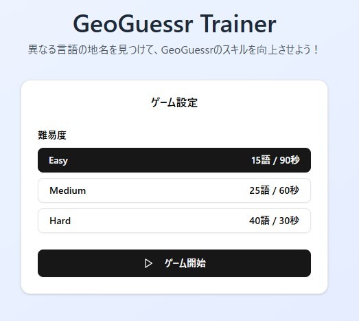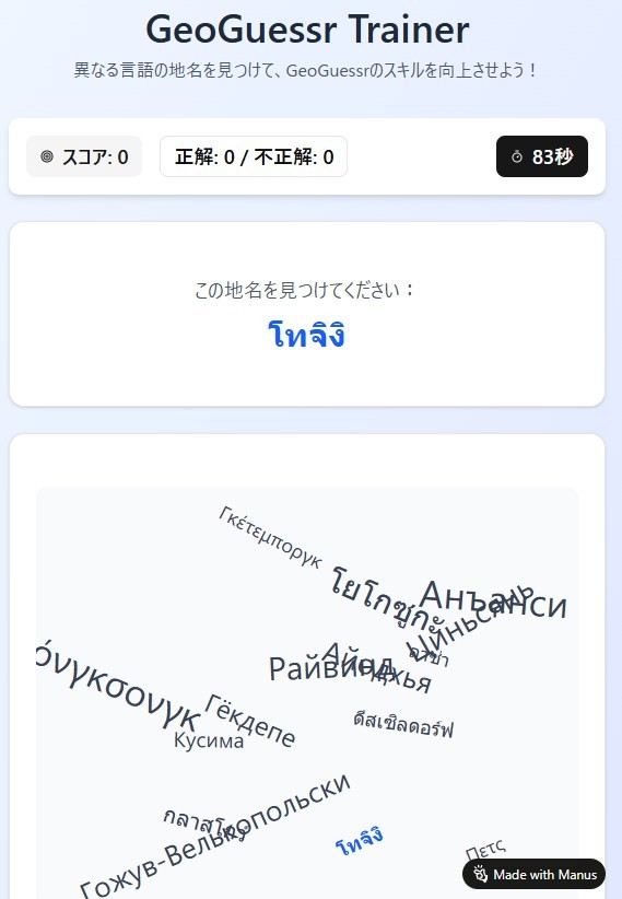 ・ストリートビューをみて地図から場所を推測して当てるゲーム「GeoGuessr」を遊んでいるので、それのための訓練ができるようなミニゲームです。