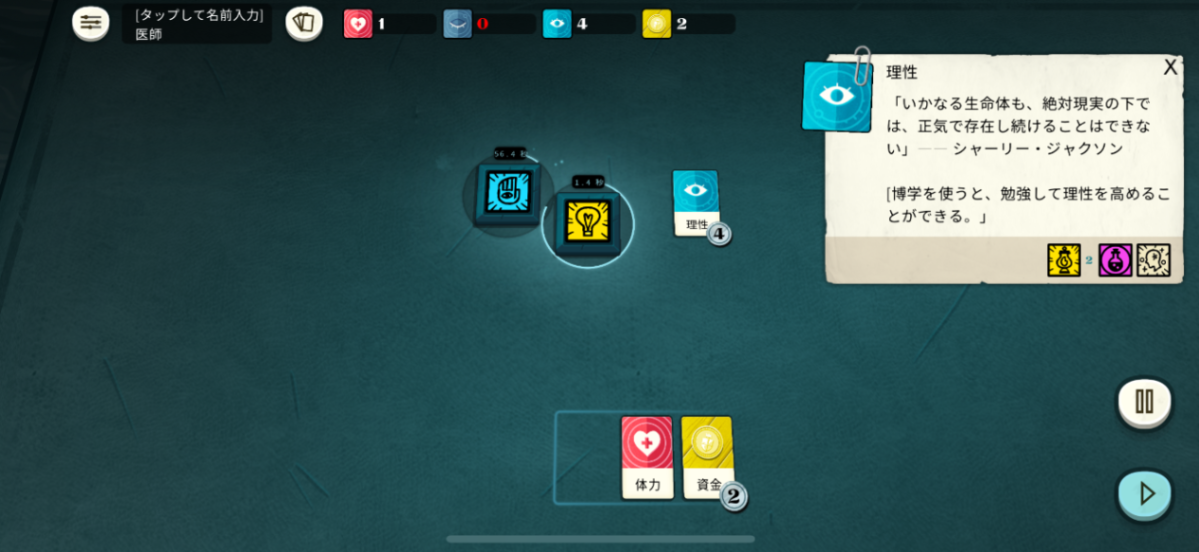 (ゲームの画面はこんな感じ。理性、資金、体力などのカードを上手く駆使してカードを集めたり、利用して進める)