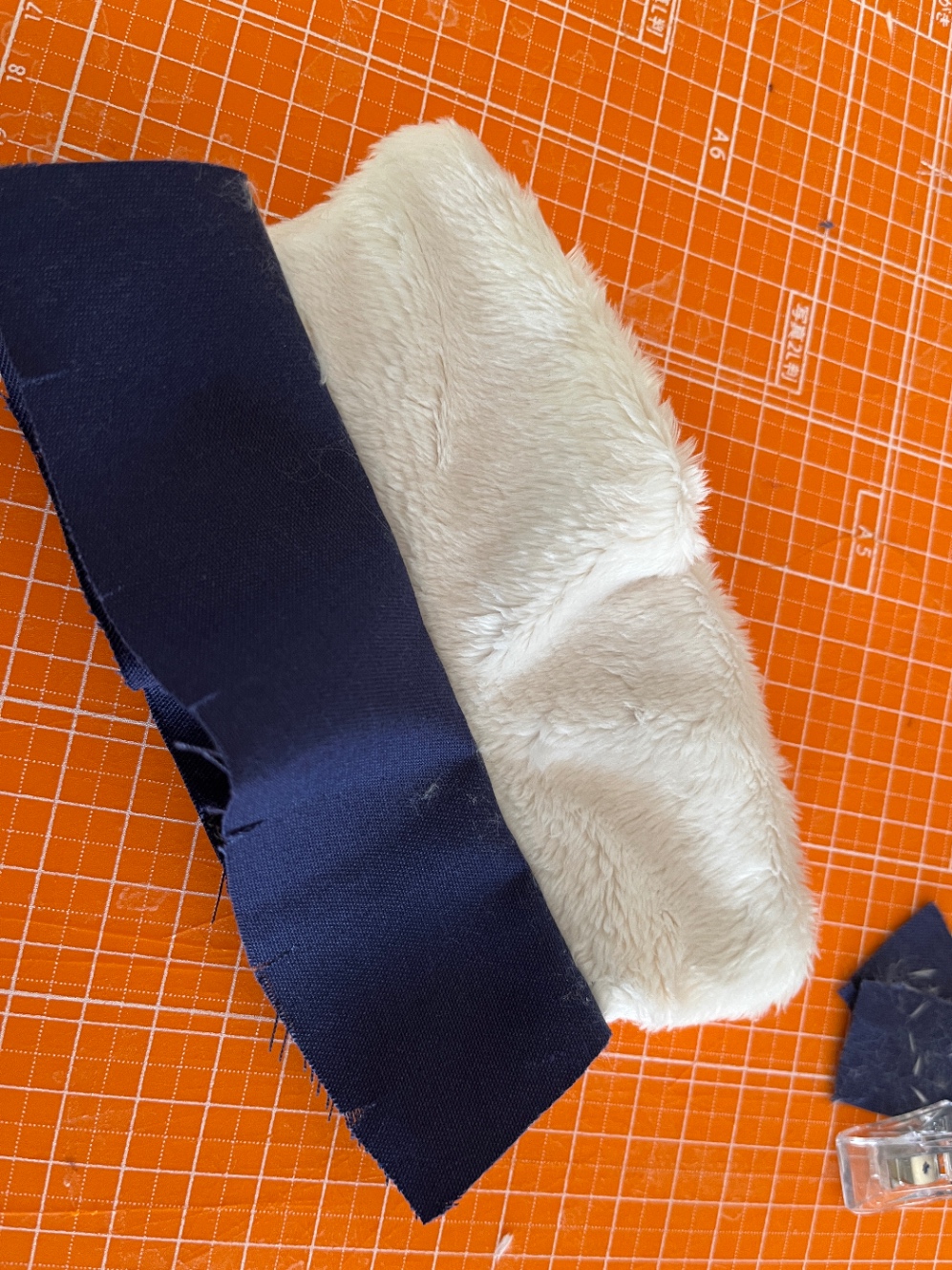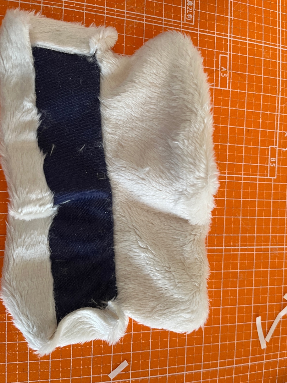 いつものように縫いしろは接着剤でつけようかと思ったんですが、マント本体に襟をつけないといけないのと、襟(ボア)切断面からの抜け毛が確かにヤバすぎ&曲線なので、接着テープを貼るのが面倒になり、仕方なく縫うことにしました。