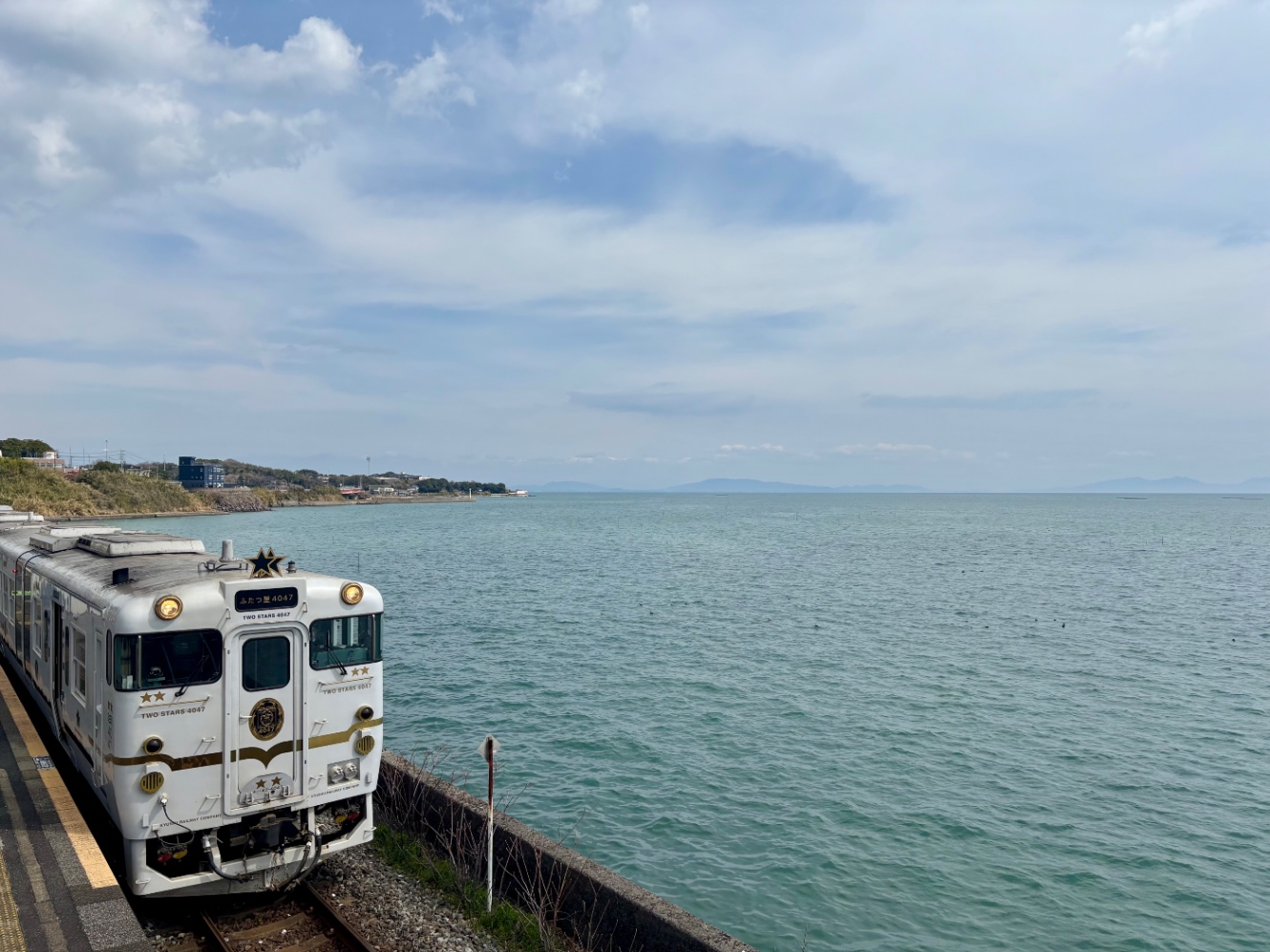 天然温泉が気持ちよくて夜と朝と2回入った。武雄からは観光列車ふたつ星でゆっくりゆったりと長崎へ。車窓から過ぎゆく景色を一望できて楽しい。田畑の中をぽつぽつと立つ家々、背後に聳え立つごつごつとした山並み、そんな中を少し過ぎると眼前に広がるのは有明海。青く穏やかな水面は鷹揚と揺らめきながら、陽の光を受けて燦々と煌めいている。奥の方、空との境目には対岸の山々が霞んで見えた。ときどき駅に停まって駅舎を見たり出店でみかんジュースを買ったりした。