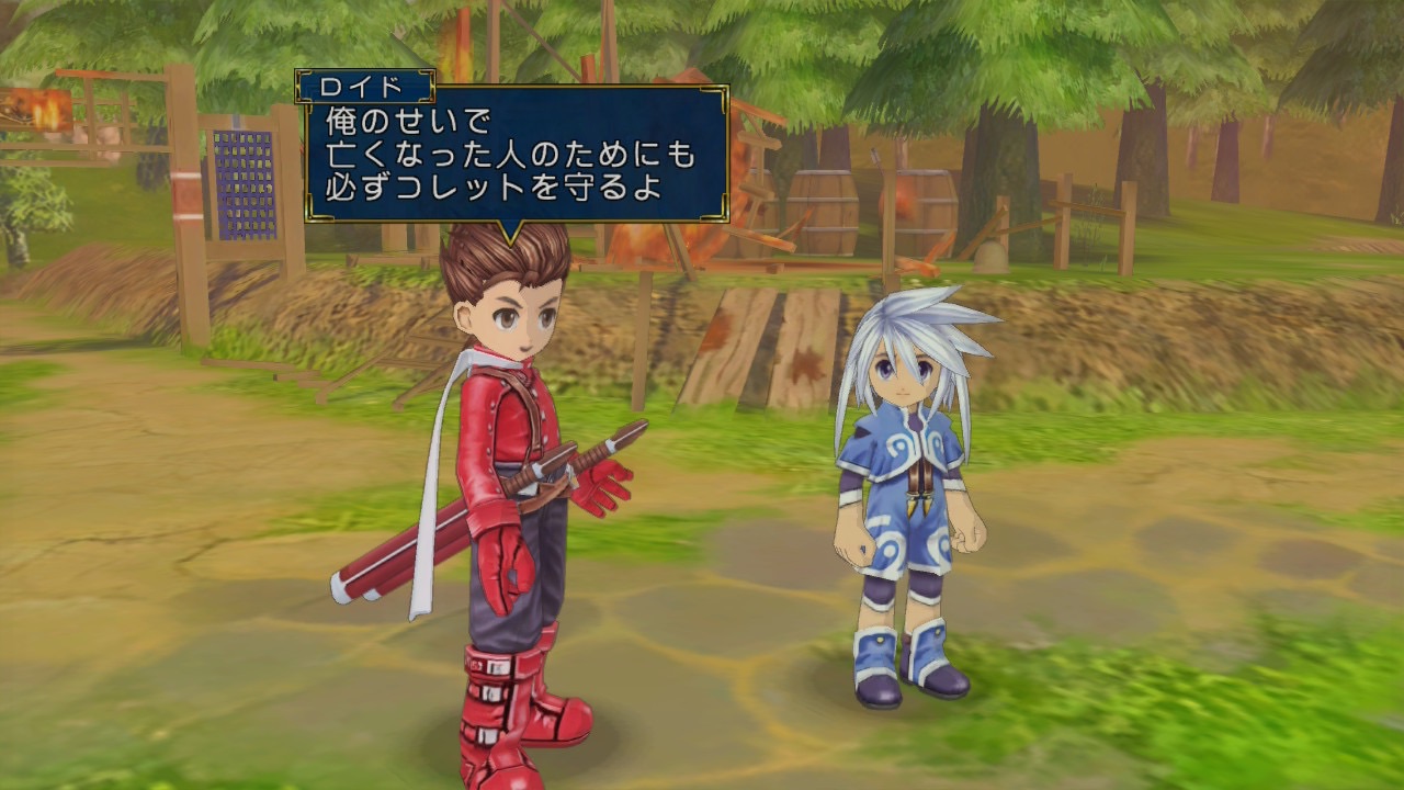 まー、こんだけ焼かれたら追い出されてもしゃーないか。恨まれて追い出されるときに、ばーさんから、それならコレットたちを守って世界を救ってくれ、といわれます。