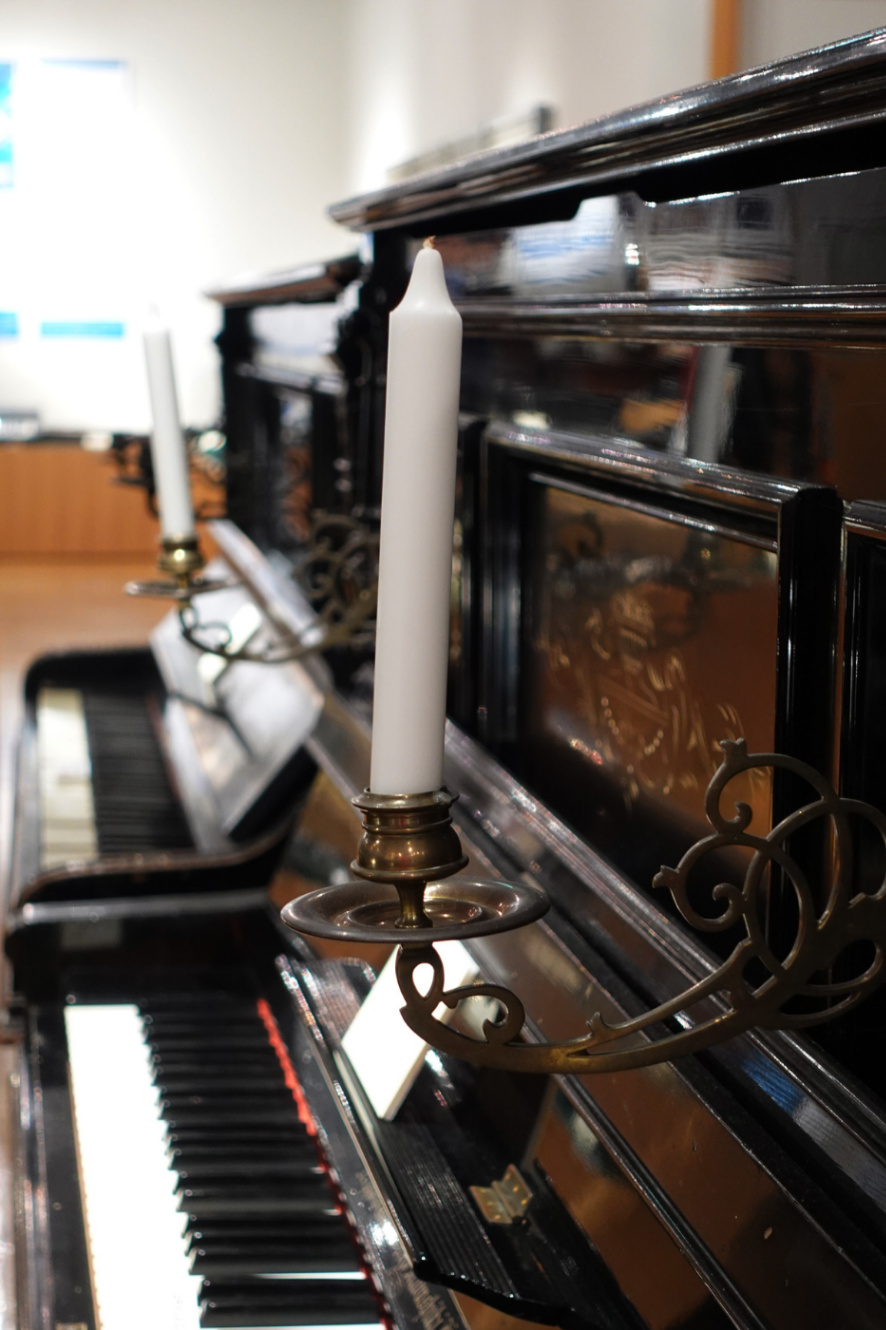 昔のピアノにはろうそく立てがついています。楽譜に火がつかなかったのかと心配に。