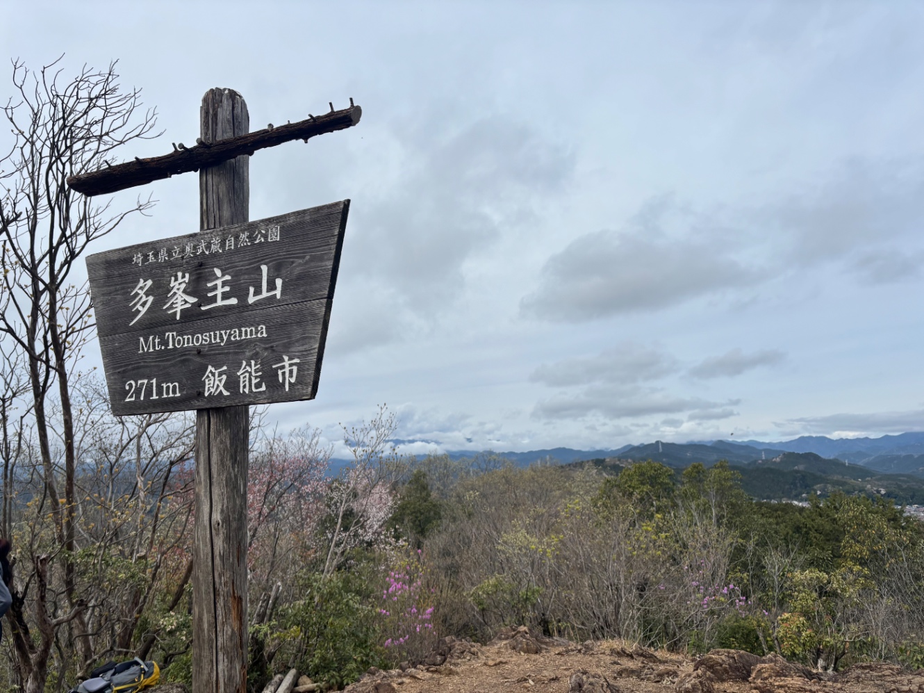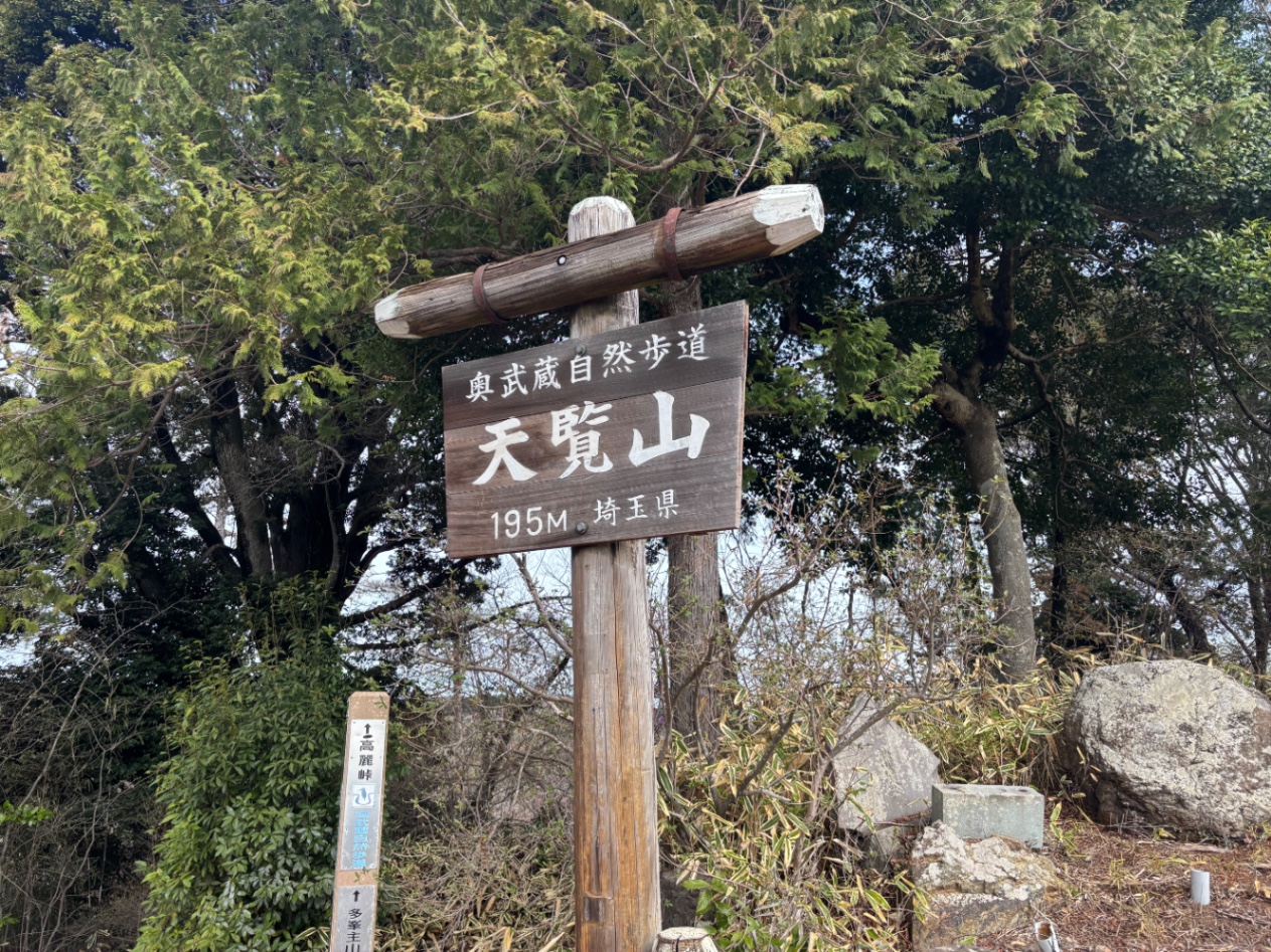 傾斜を登り始めると少し汗ばむ。あっという間に天覧山山頂へ到着。雲が多くてこの日は富士山は見えず。