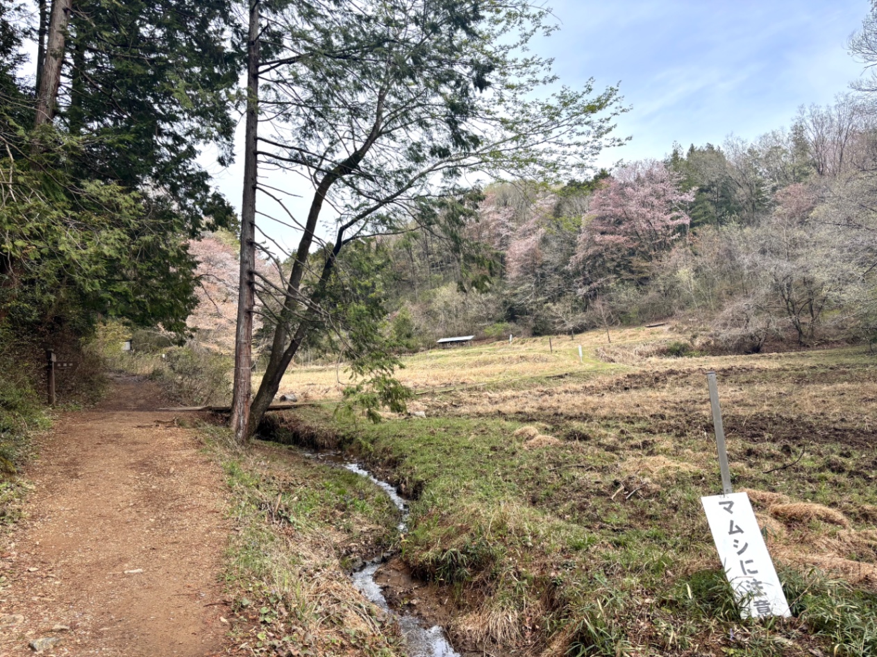 天覧山を駆け降りると、里山という風景。途中、向かい側の森で枝が派手に落ちるのを見、ぎくりとする。