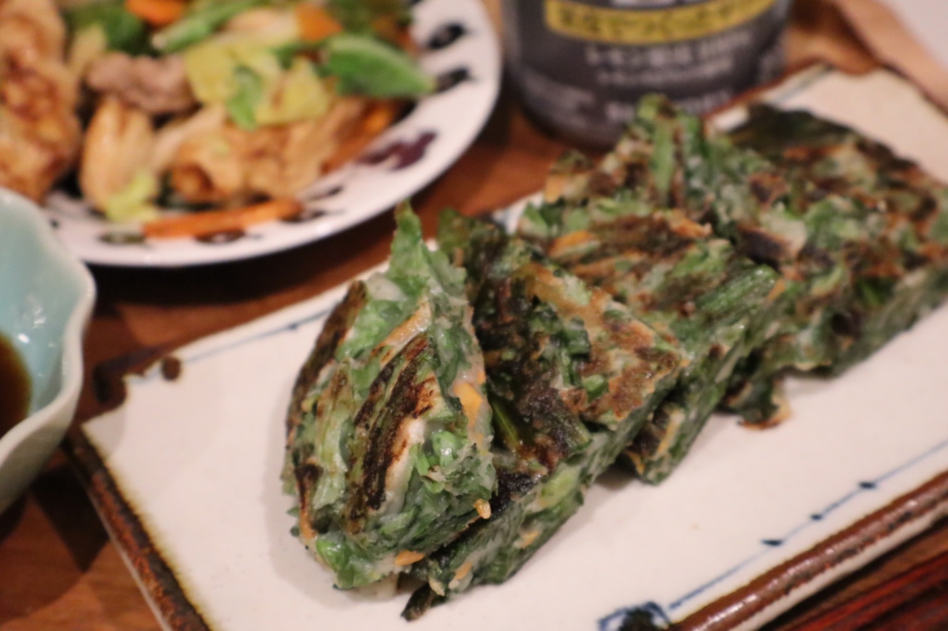 弁当用の常備菜も作る。蓮根と人参のきんぴら、カボチャの煮物、鶏のつくねなど。棚に眠っていたチヂミのキットを見つけ、春菊で作る。本来のつくり方ならもっと記事の分量の方が多いのだろうが、ほぼ緑のチヂミ。しかししっかりとモチモチ感は残っていて美味。麩チャンプルーとともに夕飯にした。