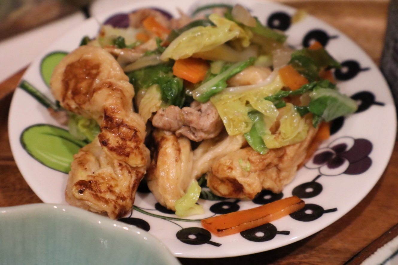 夕方から集中して料理をした。石垣島で買ったくるま麩を使って麩チャンプルーを作る。沖縄に行くといつも食べる麩チャンプルーだが、レシピを知ったのは初めて。2センチ程度の幅で切って水で戻したあと、よく水を切って出汁と溶き卵に浸し、良く吸わせる。それを多めの脂で焼き色がつくまで炒める。別で炒めておいた野菜と炒め合わせ、味付けをして完成。もちもちとして歯ごたえのある麩が美味しい。