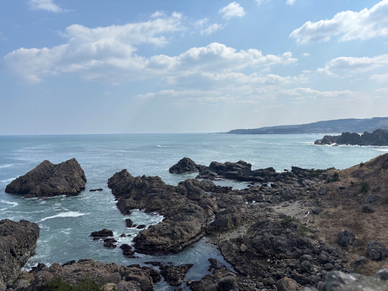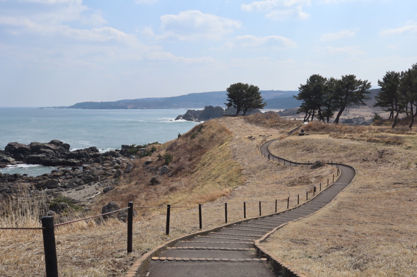 新幹線に乗る前に海が見たくなり、葦毛崎展望台へ行った。旧日本軍の見張り台跡地で、行楽シーズンは駐車場に入れないのである。冬場なので観光客が少なくていい。ここから約5キロほど海岸線を遊歩道が続く。今度走りにきてみたい。