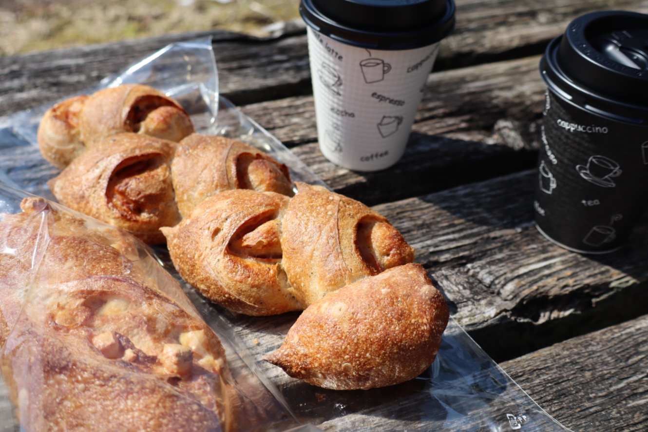 早めのお昼に、道の駅に併設のショップでパンとコーヒーを買った。パン屋は理想的なハード系だった。顎が疲れるくらいむりむちと堅いパンが好きなのだ。迷いに迷ってベーコンエピ、チーズを混ぜ込んだバゲット、イチジクとクリームチーズ入りのパンにする。並びにあるコーヒー店は穏やかな紳士がひとりでやっている。今日のおすすめを頼むと豆から挽いて淹れてくれる。まだ蕾が膨らみ始めた程度の桜の下のベンチに座って、お喋りしながらのんびりと味わう。