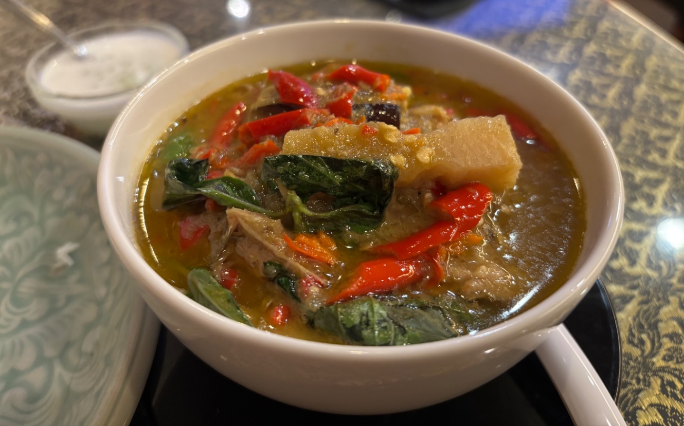 相変わらず容赦のない辛さ。存在感を放つ赤い唐辛子。青唐辛子も入っている。唐辛子が刻まれて種が入っている時点で、見た目が強い。焼いたナスやタケノコ、やわらかいチキンが入っている。こういうのは辛くても水を飲んではいけない。水を飲むと辛さの成分が満遍なく口の中に広がり、更に辛くなる。辛い、舌が痛い、と思いつつ、脳から何かが出てくる感じを味わいながら食べる。