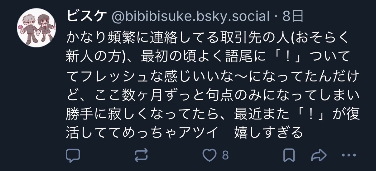 ブルスカでも呟いたけど、取引先の人の「!」がまたちょっとずつ増えてきたことが嬉しい。私はビジネスメールの硬い文章が未だに慣れなくて、句読点のみのメールだとソワソワしてしまうので「!」があると少しほっとしてしまう。