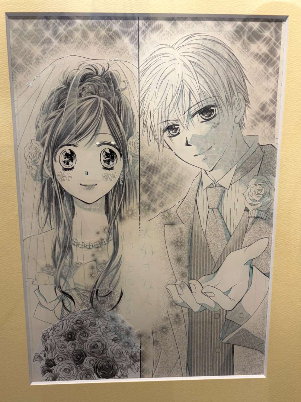 水瀬先生の「ハチこい」の原稿。ブーケのところ別で貼ってたんだ……!?女の子の髪の流れに沿うように効果トーン貼って、白い網トーン?みたいなものを上に貼ってベールの透け感出したり……少女漫画のトーン表現って見てて楽しい。あと全然修正跡がなくてびっくりする。