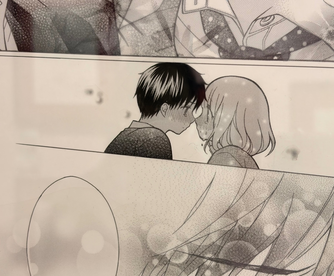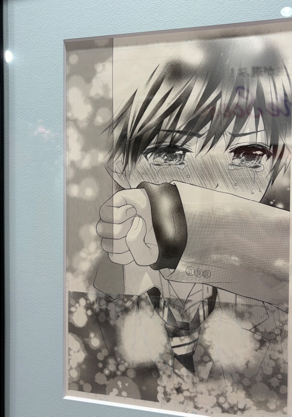 こちらはくまがい先生の「片ラビ」の原稿。主人公を救うために男の子が何十年もタイムリープし続けていたんだけど(ネタバレ)、それを知った主人公が感謝を伝えたら男の子が思わず泣き出してしまったシーン。大大大大好きなシーンなので拝見できて嬉しい。網トーンのぼかしが綺麗すぎる。