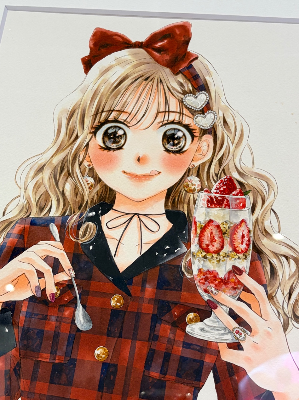 こちらは最新作「青ロテ」のイラスト。たしか雑誌の表紙に使用してたもの。水瀬先生のカラーイラストが好きなのでたくさん拝見できて嬉しかった…。小物とかネイルみたいな細部までとにかくキラキラでかわいい〜〜!