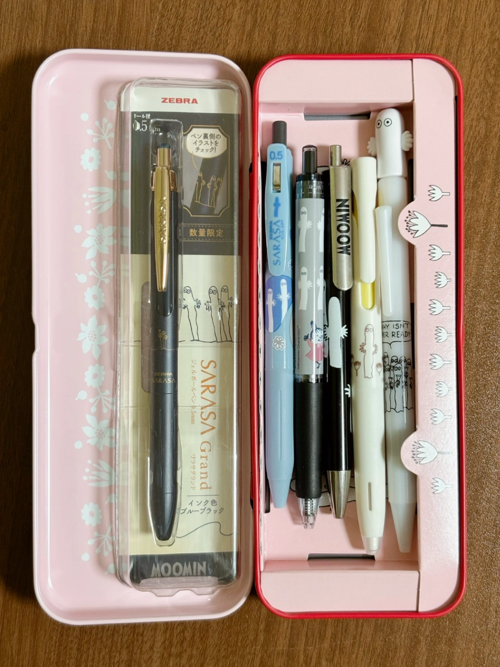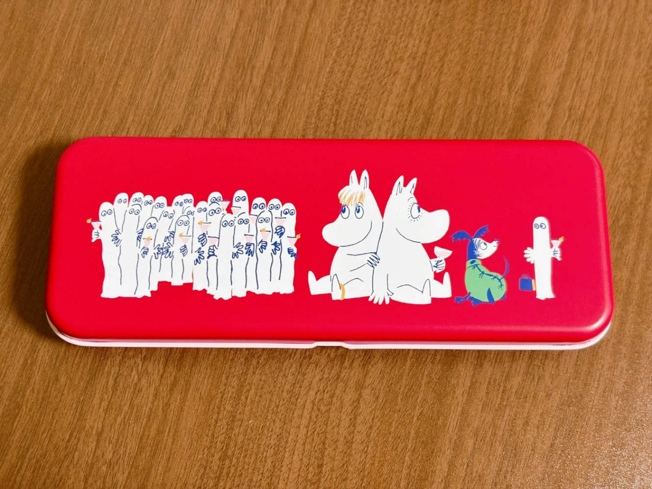 ペンを入れているのはメリーチョコレートのムーミンコラボ缶。数年前に友人からもらいました。ペンが当たってカシャカシャいわないように、紙の仕切りをそのままにしています。一緒にチョコレートを見に行ったとき、私が買おうか迷って買わなかったら帰りにこれを渡されて「とんでもねえなこの女」と思った記憶があります。全然買うとこ見て「かわいいもんねコレ😊欲しくなっちゃうよね分かる🤭」と思ってた。