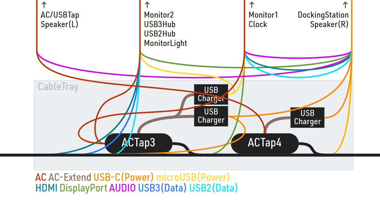 机の上に伸ばすケーブルを4系統に整理して配線している。ACTap3につないでいる2つのUSB充電器は、もともと高出力の4ポート品1台で賄っていたものを、2ポート品×2台に分岐させた。