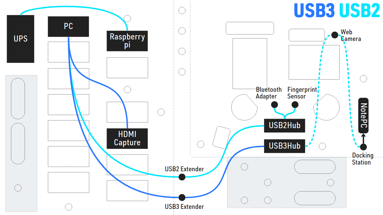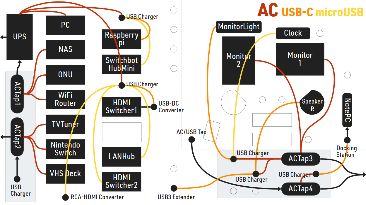 Raspberry piとUPSを接続して、バッテリーの状況などを取れるように。Raspberry piにはUPS管理ツールのNUTを入れていて、停電が発生したらPCとNASに対して自動シャットダウンを走らせるように設定済み。Webカメラとドッキングステーションをつなぐケーブルは常設。私有PCにつなぐときは別にケーブルを用意する。