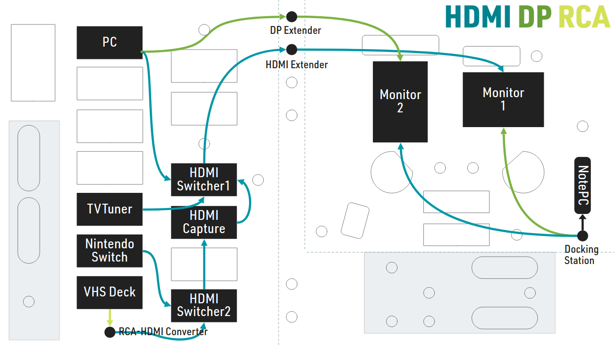 縦置きモニターはPCに直結。横置きモニターはPC・TVチューナー・Switch・VHSデッキのいずれかの映像を、HDMI切替器1で選択して表示する。SwitchとVHSデッキは間にHDMI切替器2とHDMIキャプチャーを噛ませていて、どちらか一方の映像のみをHDMI切替器1に出力。HDMI切替器2を操作する機会は相対的に少ないので、HDMI切替器1のみをリモコン制御可能としている。