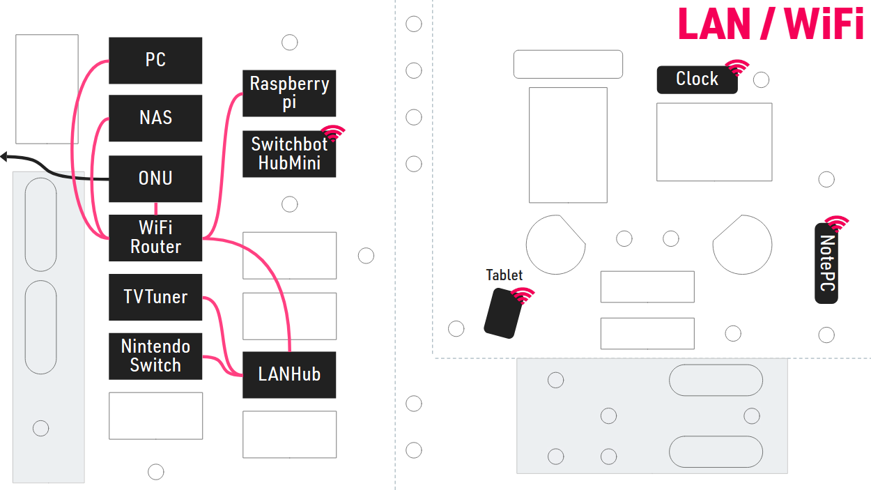 Raspberry piはどうしてか無線でうまく動作しなかったので有線で繋いだ。社給ノートPCはゲスト用アクセスポイントに接続させて、私有機器とは通信を分離させている。