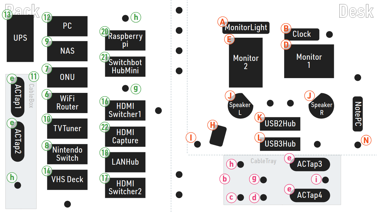 ラック側・デスク側でそれぞれ完結させるという前提で設計。