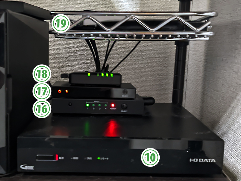 ⑯ HDMI切替器 ELECOM DH-SW4KP41BK。リモコン操作に対応したHDMI切替器。Ⓓの横向きモニターに表示する内容を制御する。