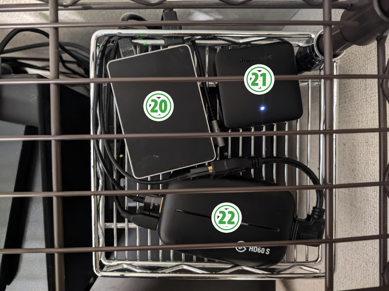 ㉒ HDMIキャプチャー、Elgato HD60 S(廃番。リンク先後継品)。⑧⑭の映像をPCに取り込むために使用する。