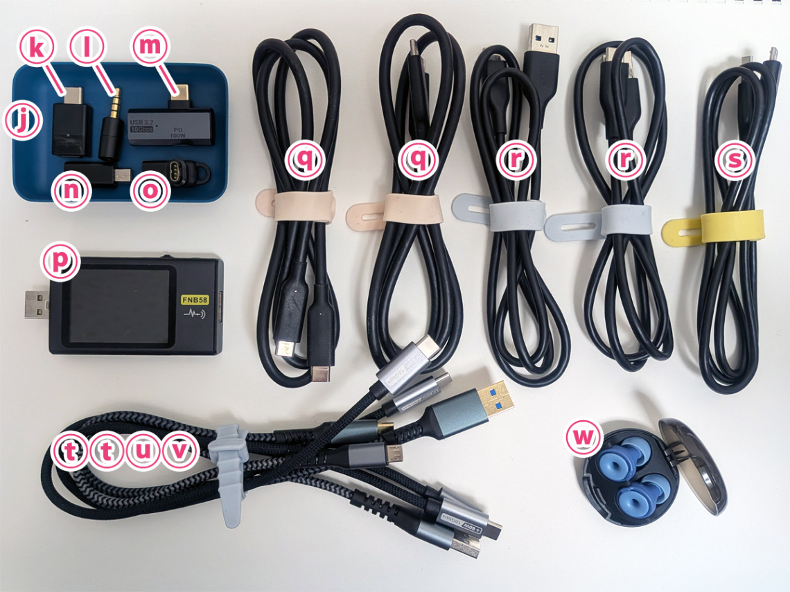 ⓠⓡⓢⓣⓤⓥ USBケーブル類。充電器につないだり、USBハブにつないだりとマルチに活躍する。