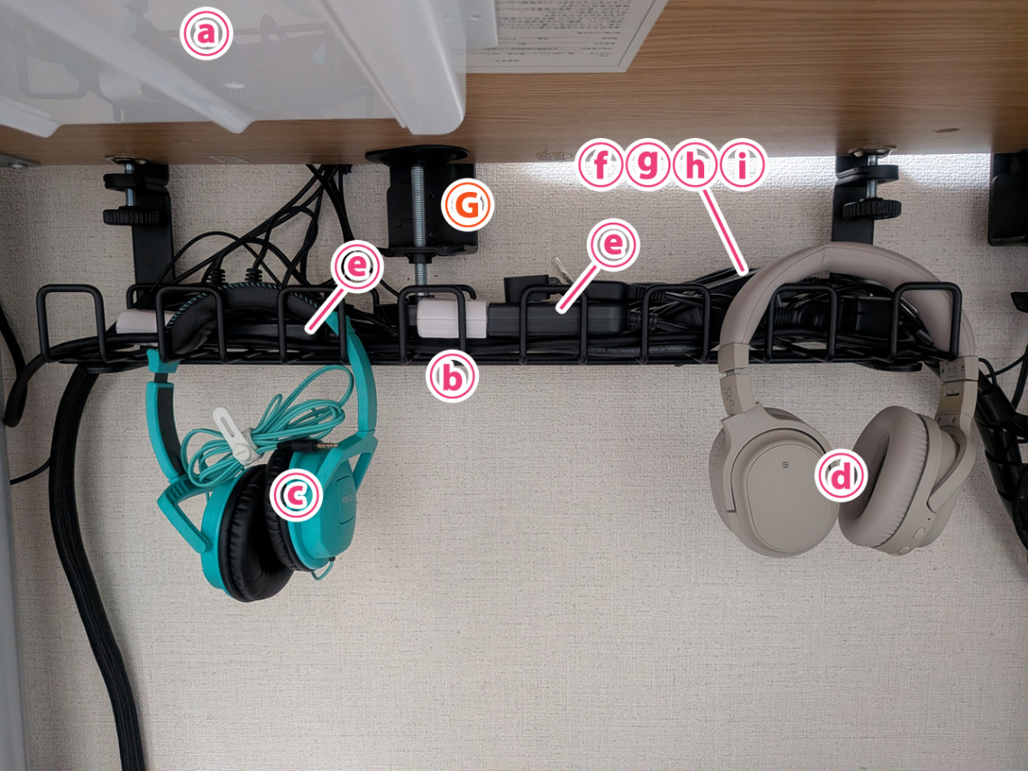 Ⓕ 骨伝導イヤホン Sudio B2。主に在宅勤務時のミーティング用だが、マルチペアリング対応なのでPCやタブレットにもペアリングはさせている。左側の本棚にケーブルホルダーを貼って、そこに引っ掛けて定位置にしている。