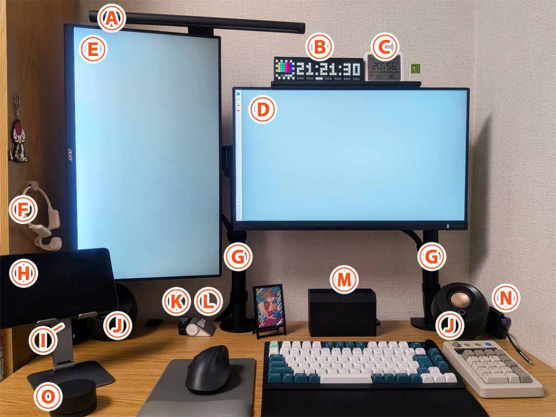 Ⓔ 縦置きモニター、Acer B247Y(終売?)。21.5インチのコンパクトなフルHDモニター。机の横幅が狭いせいもあって縦置きにしているが、縦置きのほうが情報の一覧性が格段に上がるので、2枚以上のディスプレイがあるなら1枚は縦置きをお薦めしたい。