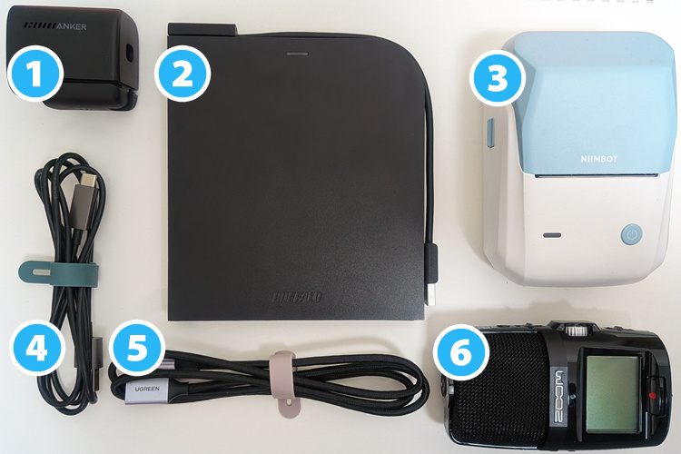 ③ モバイルプリンター EPSON PX-S06W。プリンター・スキャナーはいずれも使用頻度が低く、使う時だけ机の上に持ってくるというスタイルで運用しているので、とにかくコンパクトで持ち運びやすいものという観点でセレクト。