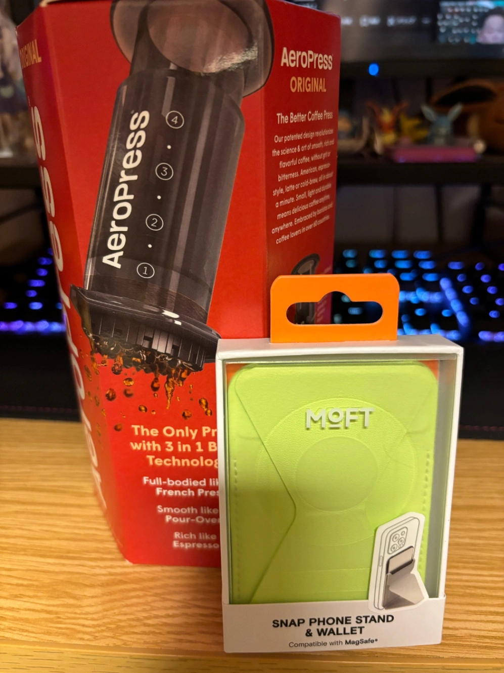 今日はHaるさんの個展へ。サインももらったぞ~エアロプレスとMOFTを購入。MOFTはずっと使ってたこの子がもう限界です。世代交代。個展での買い物。アクスタめっちゃ厚い。例によって粕谷さんのレシピで初エアロプレス。ぐだぐだになりながらそれなりに美味しい。飲み口はかなり軽いんだけど、豆量が多いから結構キマります。慣れないのもあるけど結構難しいんですけど…。ていうかエアロプレスは割るんやね。知りませんでした。エク