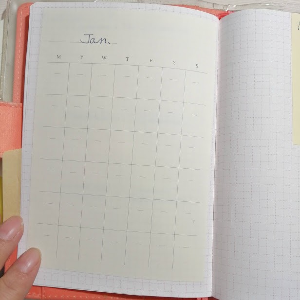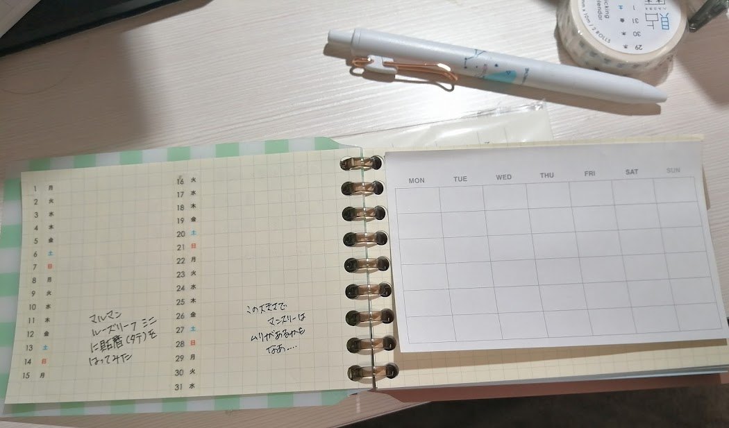 マンスリーログは無地のルーズリーフに無印良品のフリースケジュール付箋を貼る(下写真)