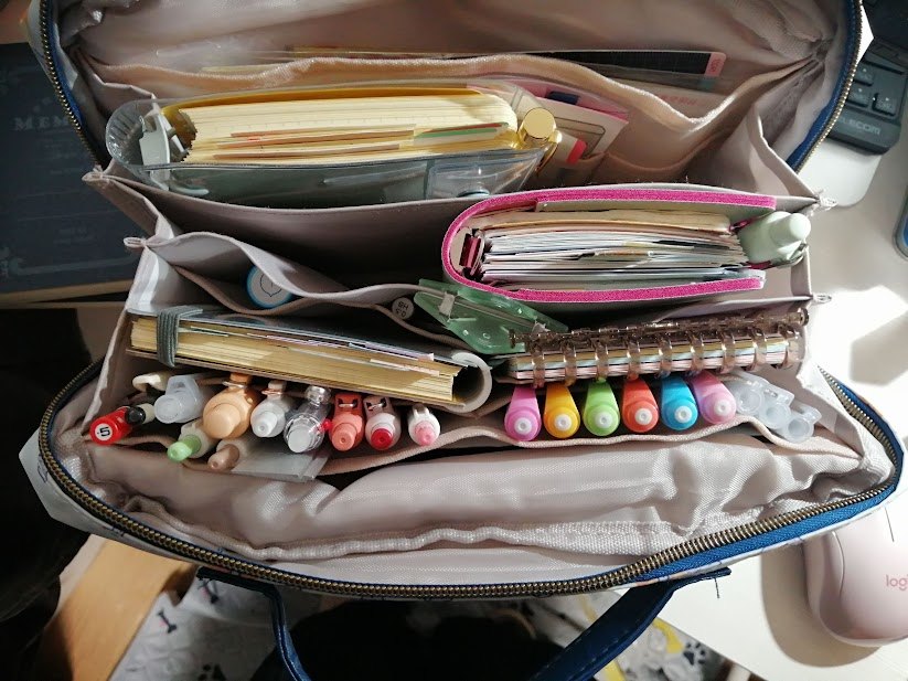 細かいポケットもたくさんあって、付箋やテープやクリップなどの事務用品も余裕で入ります。